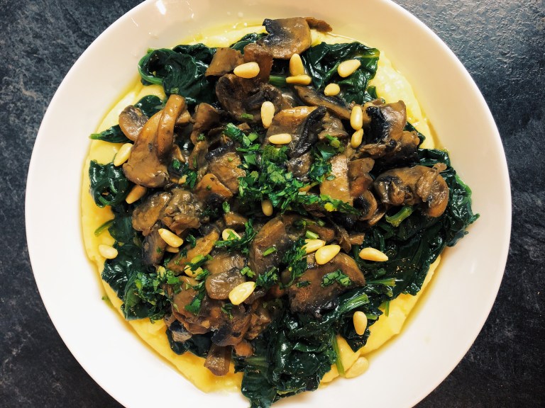 Across Italy and particularly in the northern regions, stews and braised meats are served over polenta during the colder months. Before I ate a vegan diet, I would do the same, making a rich polenta with butter, cheese and then more butter. In this recipe I have left out the vegan cheese, though that would work wonderfully, and substituted my favourite vegan butter, topping the polenta with a layer of tender spinach, then savoury, meaty mushrooms. A variation includes making vegan-friendly polenta with canned coconut milk though we thought that tasted a bit too sweet for a dish with such umami wallop.