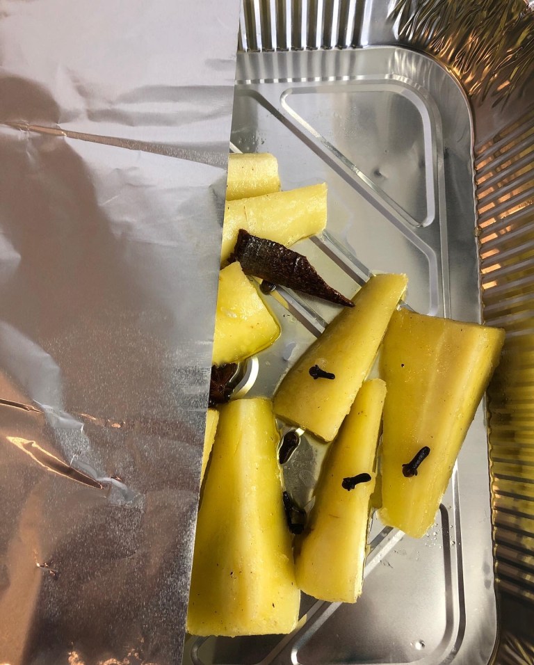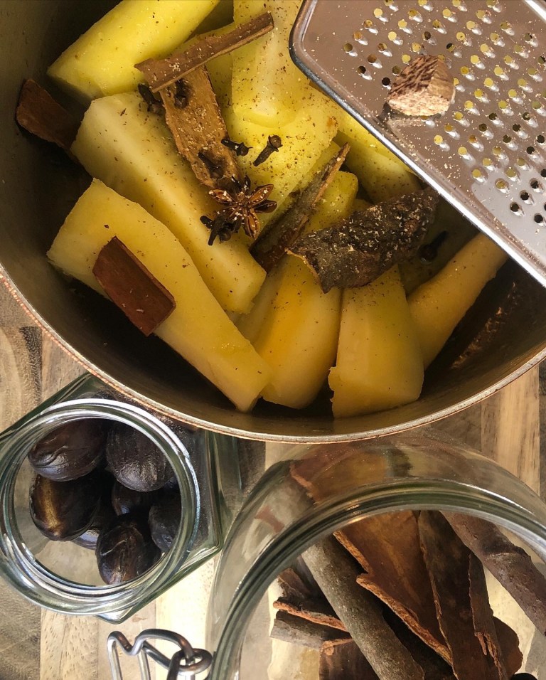 Add the oil/honey/salt mixture to the parsnips and stir to ensure they are all throughly coated. Add 2-3 star anise, a teaspoon or 2 of whole cloves, a generous grating of nutmeg, some cinnamon bark and stir to ensure all the parsnips are coated. The cinnamon bark I have used is from India so it looks different but the bark you can buy here is fine to use too. Stand back and revel in the steamy scent of Christmas for a few seconds. This is the most important part of the recipe!
