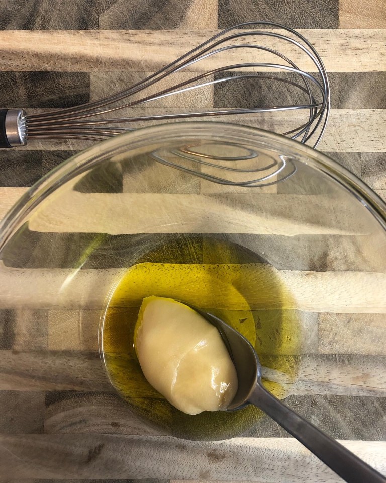 While they parboil, if you’ve already got your ingredients handy, you will have time to measure the olive oil and honey into a mixing bowl. Add the pinch of salt to this mixture. Don’t worry if the honey and oil don’t combine, they will meld together beautifully as you stir them into the parsnips, thanks to their residual heat.
