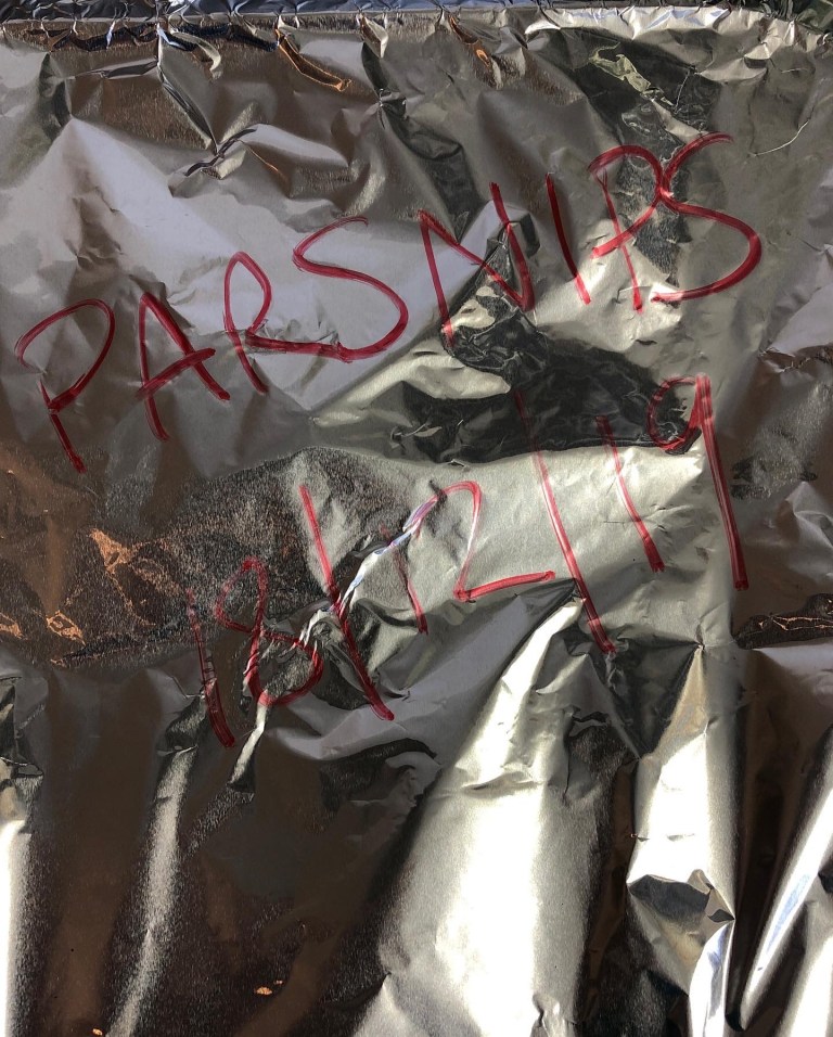 Tip the parsnips and their regal dressing into an oven tray. I use disposable tin foil ones as they are recyclable where I live.