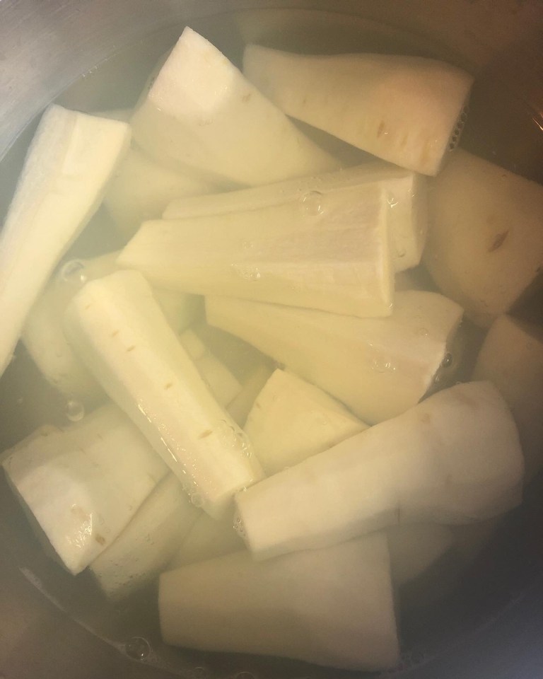 Drain the parsnips when you are happy they are parboiled, then tip them back into the pan. Turn the heat off if you’re placing them back on the stove.