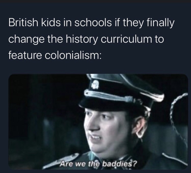It’s a lot more nuanced than this meme, but… it certainly isn’t comfortable. Our school history curriculum steered away from the true meaning of colonialism and empire. We learned about the exploration of the Pacific and the ancient cultures found in those lands, not the atrocities committed by the explorers. The Missions. The Crusades. We learned about the American Civil War and the slave trade, almost as a concept, really, not truly understanding how our hand played a part in the devastation of native people in America and how we trafficked people from Africa. And how we built our world on their whipped and broken backs, quite literally. It is hard to teach kids about that level of almost indescribable cruelty.