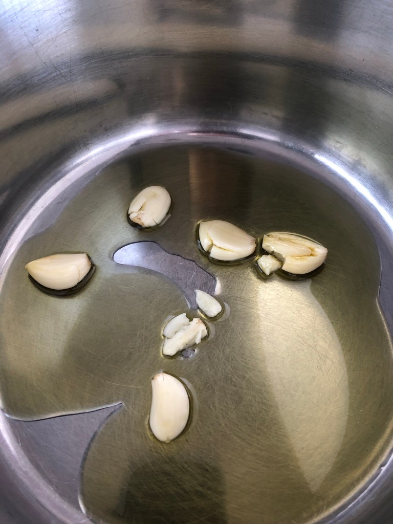 Bash and peel the garlic cloves, add them to the warm oil and fry for a few minutes, taking care to not brown or burn the garlic.